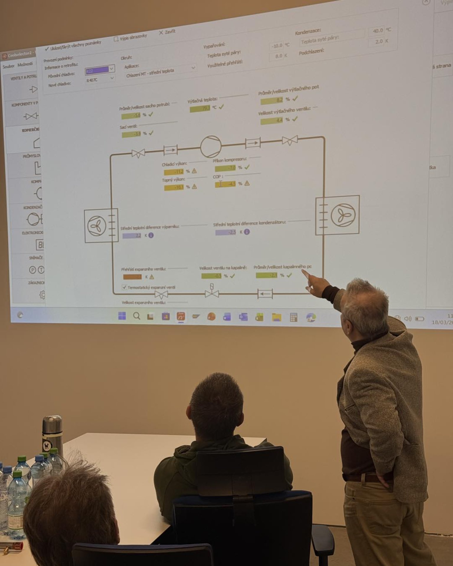 Danfoss v zastúpení p. Maťašovského, nám povedal viac o tom čo nás čaká s novými chladivami, od základov P-H diagramu, návrh chladiaceho systému v selekčnom softvéri Danfoss a nove komponenty do okruhu. Miestami to vyzeralo ako na koncerte, účastníci si fotili každý slajd