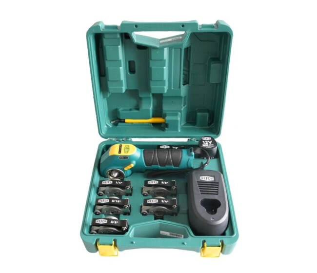Integrované LED osvetlenie zabezpečuje dobrú viditeľnosť aj v tmavých priestoroch. Celé zariadenie je dodávané v odolnom plastovom kufríku spolu s nabíjačkou, batériou a odhrotovačom (deburrer).