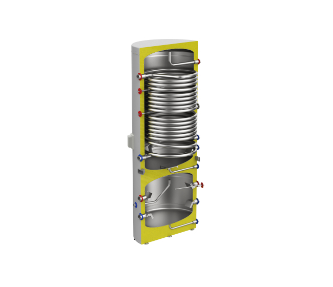 Kaisai Eco Home DHW & Buffer Tank je inovatívne riešenie pre systémy s tepelnými čerpadlami, ktoré kombinuje zásobník teplej úžitkovej vody (TÚV) a akumulačnú nádrž (buffer) v jednom kompaktnom zariadení. Toto riešenie šetrí priestor v technickej miestnosti a zároveň zachováva všetky potrebné prevádzkové parametre vykurovacieho systému.