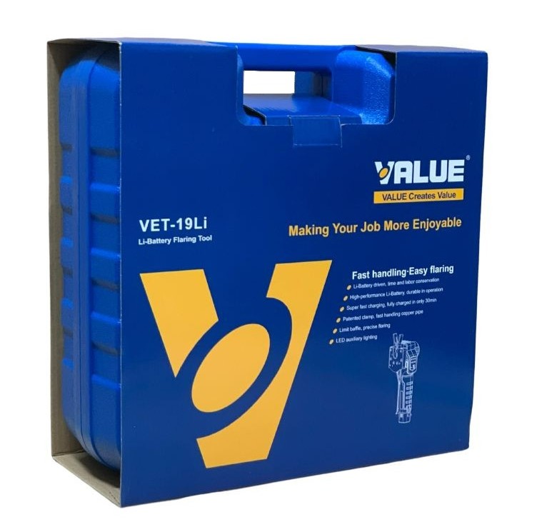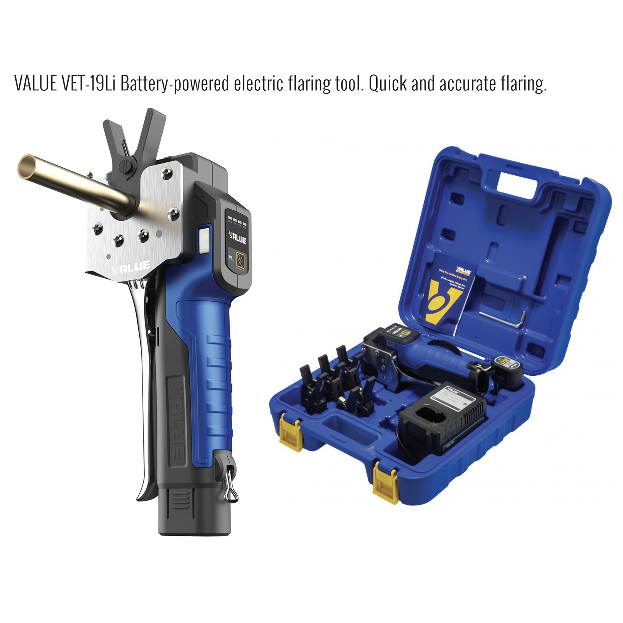 Pertlovačka rúr aku VALUE VET-19Li, prevádzka na batérie: 7,4V 2.0 Ah Li Batéria, vonkajší priemer rúrok: 1/4", 3/8", 1/2" 5/8" (16 mm), 3/4 "